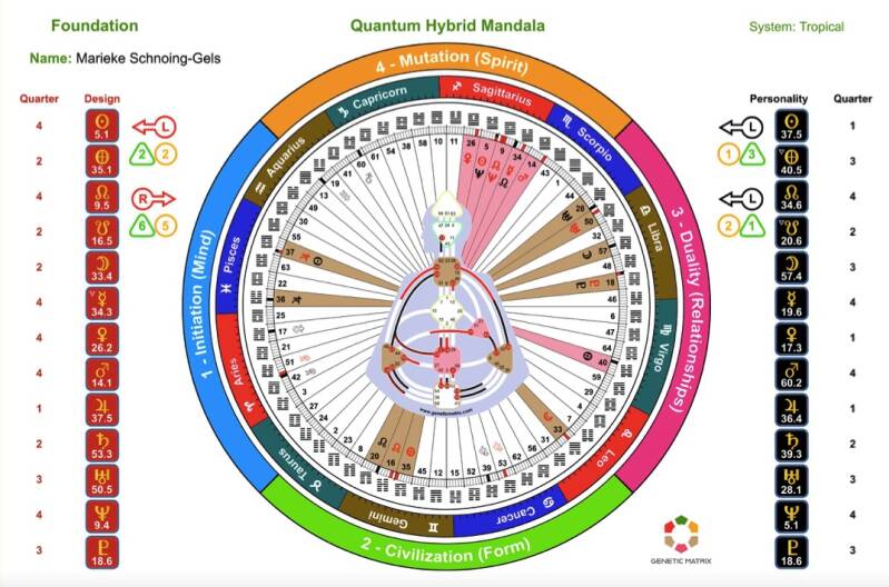 To give a description of the Gates in my design and thus what the roadmap of my design looks like, I consult various sources. Obviously from the information taught by Ra Uru Hu in the International School of Human Design, but also from Alokanand Diaz who in his book "The 64 Gates through the Rave Mandala" (2021) describes all 64 Gates from the starting point of the not-self. He describes the Gates from their connection with polarity (the perfect opposite) and with the influence the 16 Godheads have on the Gates. Alokanand writes the following about Human Design in his book (which is a reflection of a four-day course he taught in Oslo, Norway in 2014: